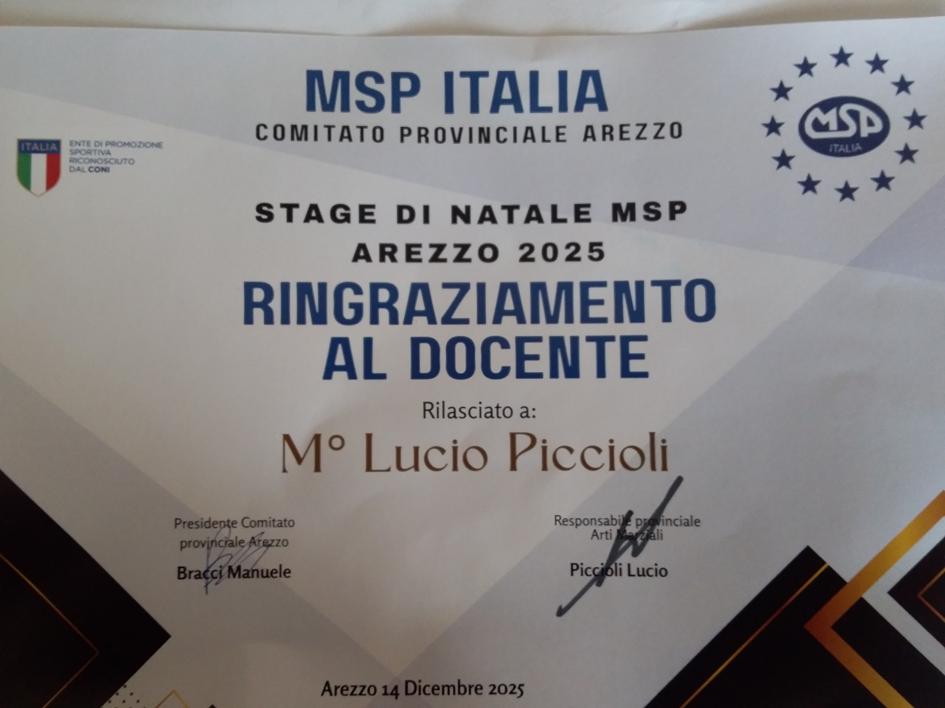 IL GRAN MAESTRO ENRICO TONI FONDATORE DELLA WSDA NOMINA IL MAESTRO 6° DAN LUCIO PICCIOLI RESPONSABILE PER LA PROVINCIA DI AREZZO